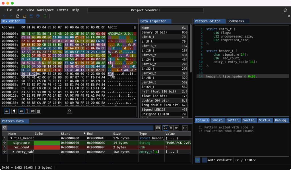 Just like that, that small bit of script code on the right, automatically parsed and highlighted all the stuff in the hex view, and put it in a digestible form in the Pattern Data view below. Not sure if this tool is the perfect reverse-engineering tool, but it’s damn close.