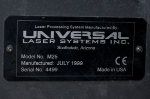 (more…)Had a little time after work today so I thought I’d try and test fire the laser as it working is pretty much the deciding factor on the fate of this project. After a bit of googling, I found a manual for a ULS OEM laser that contained the connector pin-out. I cut the wiring harness apart, separating out the links to the laser. I still want to use the original power supply if I can. So first thing I did was fire up the power supply, and was happy to see it was outputting at the desired 48V. Next I set up the laser aimed at a concrete block wall, with a piece of card stock as a target. Following the pin-out in the manual I found, I wired in the interlock safety loop with a key-switch, and then used a two way momentary switch attached to an external power supply to trigger the aiming visible red laser, and the CO2 burning laser. I re-applied power, and the laser fan spun-up making a terrible noise… sounds like a blade is hitting the guard, or a bearing is shot… either way, that will need to be replaced. Next I tested the visible laser, and was happy to find it working. [this was a bonus, I was not expecting an integrated visible pointing laser] Then I armed the laser by flipping the key to the safe position and tried firing the CO2 laser…. nothing. My heart sank, I thought perhaps this find was too good to be true.